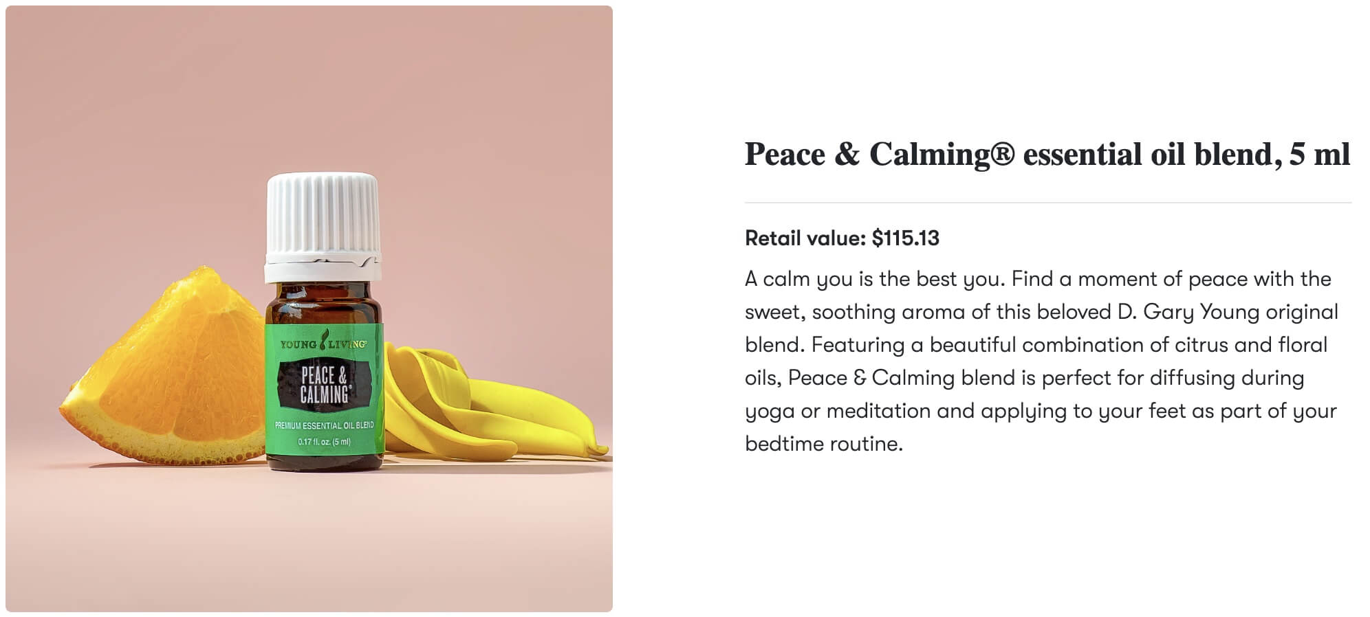 A calm you is the best you. Find a moment of peace with the sweet, soothing aroma of this beloved D. Gary Young original blend. Featuring a beautiful combination of citrus and floral oils, Peace & Calming blend is perfect for diffusing during yoga or meditation and applying to your feet as part of your bedtime routine.