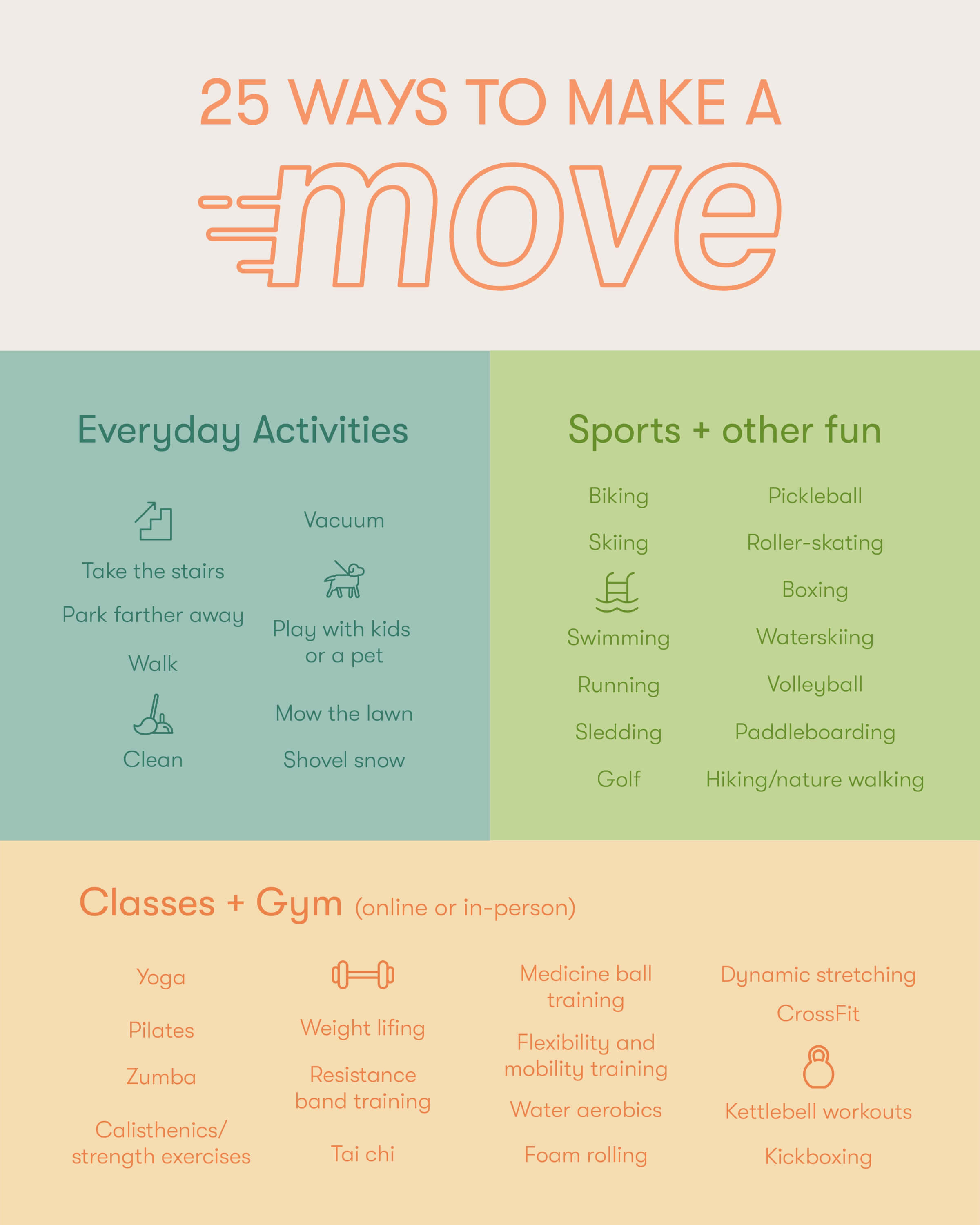 Some days when I decide to start something new I think I need an elaborate plan and need to make sure I have everything lined up before I invite people to join me. In reality, I should just start. Nothing against planning. I definitely need to work on planning but when it comes to deciding to start a movement group for only 14 days it is not rocket science and it shouldn’t be for you either! So, for Day one all you have to do is pick one thing to do. Take a look at the image below and it should give you some ideas if you don’t already know what you want to do.