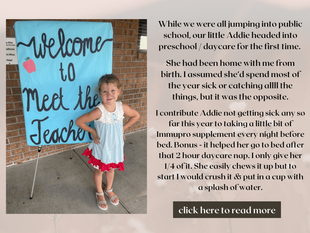ImmuPro is one of our favorite ways to support the immune system! These chewable tablets contain Ningxia wolfberry (a potent antioxidant), zinc, and selenium along with melatonin (hello getting Addie to go to bed for a good night's rest after that 2 hour daycare nap) for restorative rest when you aren't at your best. Grab these tablets when you feel your defenses going down - or anytime you want a little boost!