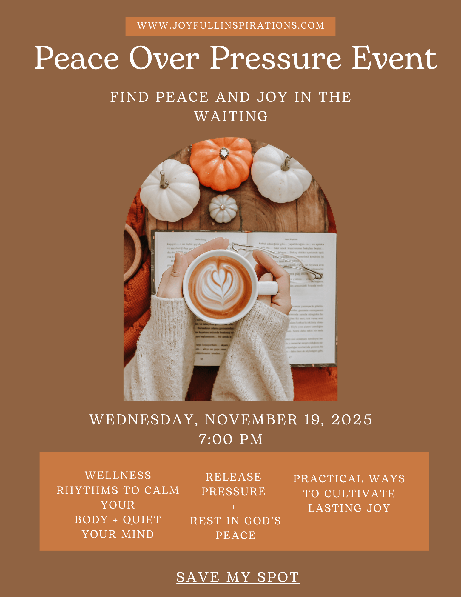 Together, we’ll explore how to release pressure, find purpose in waiting, and embrace joy — even when life doesn’t go as planned.