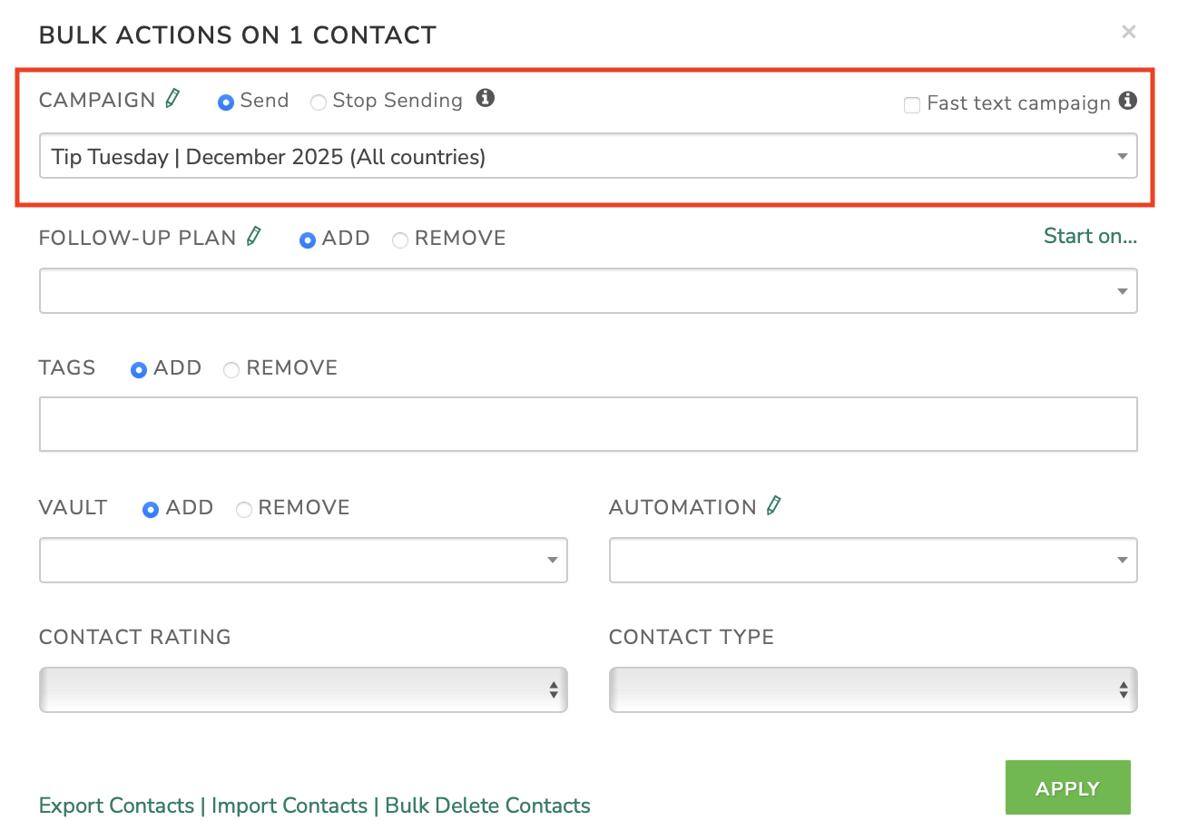 Then select the Tip Tuesday campaign for December 2025 and click "Apply" to ensure next month's content is sent to existing subscribers: