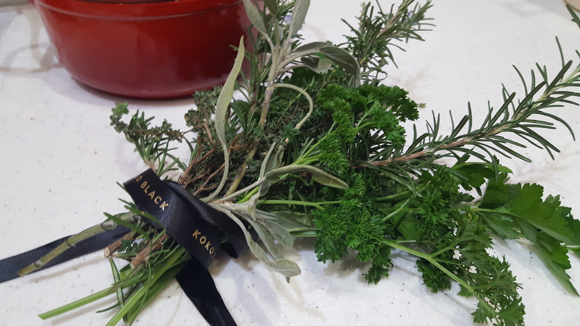 At our place we happened to have some herbs in reasonable shape  (incredible considering it's winter).  I came up with my parsley, sage, rosemary and thyme creation with a few stems of each, added a florist touch arranging them into a neat posy.  We had some ribbon I repurposed from a recent gift,  tying it loosely around the stems and voila!  It took only a few minutes and was well received.    If you have access to herbs then use whatever you have.  If not consider gifting a leafy potted herb jazzed up with ribbon or some not too fancy gift wrappng... easy to create this simple gift from a trip to your local store without breaking the bank.
