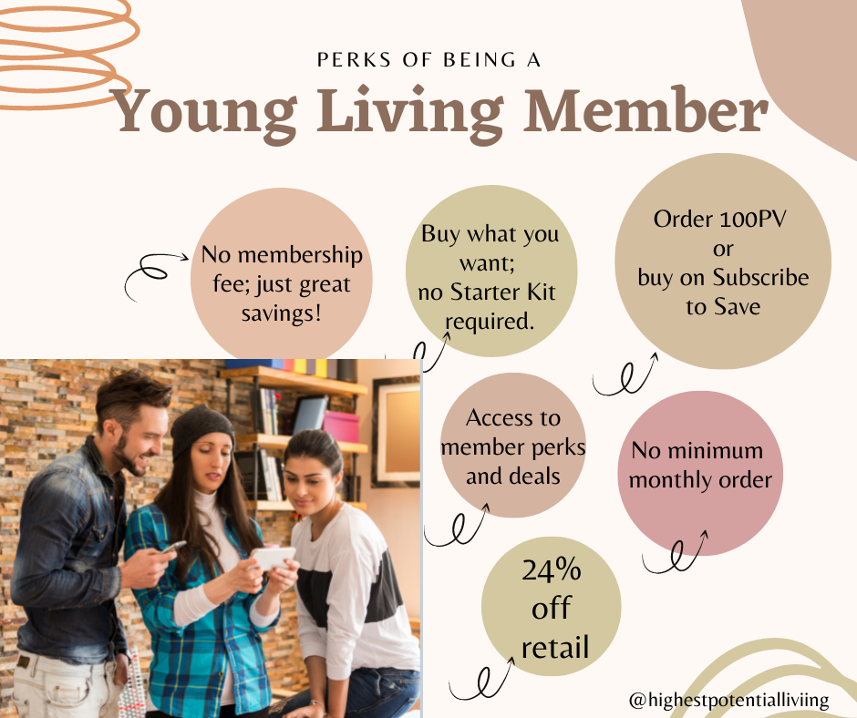 - Become a member. Right at the start, Young Living members save 24% off the non-member price on all products. All the oils, cleaning products, diffusers, makeup, personal care products, everything is 24% off retail. And with recent changes to membership requirements, joining Young Living is easier than ever. There are no kits you must buy and no monthly order you must place. All you need to do is place a one-time order of 100PV or more, OR place an order of any amount on the Subscribe to Save program. That’s it! Get the products you want at a savings you can’t beat. That’s why becoming a Young Living member is my #1 cost-savings tip.